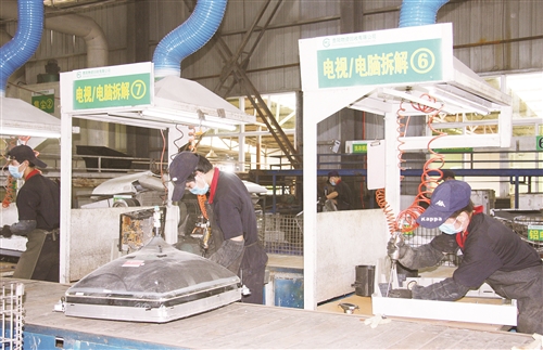 “电子产品中含有的铅、汞、镉等有害物质,长期接触对人体健康将造成严重损害,如果处理不规范,提炼过程中产生的废酸、废液等随处排放,会严重污染环境。”中心总经理王艳介绍,“在我们公司,这些电子废弃物都是严格按照规范标准进行操作的。比如这台电视机,经过拆解线就被拆解成金属、塑料外壳、线路板、CRT显示器等。其中,废塑料和废金属可经过压块和破碎等处理后出售,或按照规定制成建筑材料、日杂用品、化工产品等再生金属和塑料制品,进行循环利用。”