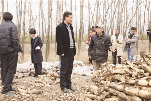 图2为徐州铜山农商银行董事长骆新超(左)深入现场,了解通过“e行无忧”平台助力当地优质农产品浅水白莲藕销售情况。