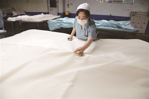 图为4月24日,山东省滨州市愉悦家纺有限公司工人在整理亚麻面料。