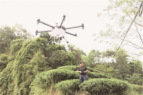 4月25日,在点头镇举州村的一处茶园里,技术人员操作着喷药无人机,植保无人机灵活自如地在低空中飞行,不时变换着速度、方向和高度,农药被均匀地喷洒在茶树叶面上,场面相当壮观。