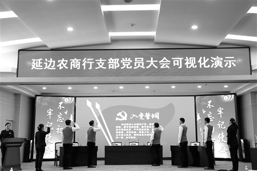 近日,吉林延边农商银行党委举办了第一期党支部书记培训班。此次培训紧紧围绕企业改革发展中心任务,以全面提升支部书记政治素质、理论素养和业务能力为重点,旨在培育政治合格、作用突出的党支部书记队伍。会议聚焦实际问题,通过现场观摩支部党员大会可视化演示、各支部品牌创建案例介绍、焦点讨论等方式,让支部书记带着问题学,在学习培训中释疑解惑、提升履职能力。图为延边农商银行支部党员大会可视化演示现场入党誓词宣誓。