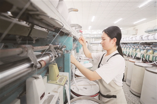 图为5月14日,在赣榆区黑林镇富林村勤拓实业扶贫车间,工人在纺织生产线上忙碌。