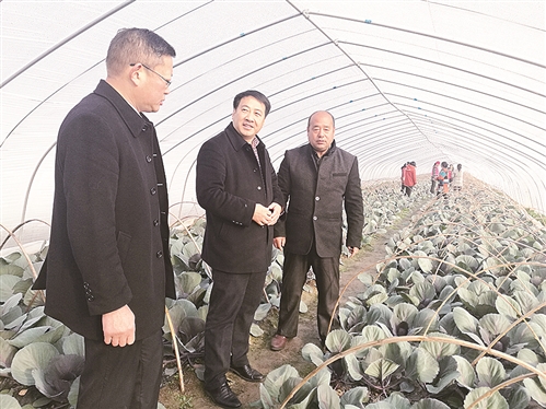 图3为泗阳农商银行行长穆振乾(中)走访调研蔬菜种植大户,了解客户金融需求,为客户排忧解难。