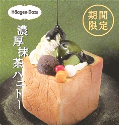 它被译为“浓浓的抹茶蜂蜜吐司”(Rich Green Tea Honey Toast),是一款涂有蜂蜜的烤面包,上面浇上哈根达斯抹茶冰淇淋。