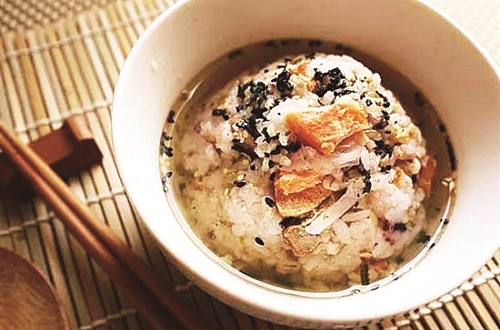 制作:将鲑鱼肉撒上少许盐,用烤箱烤熟(或用平底锅煎熟),然后用手剥成小块状备用;绿紫苏切丝备用;将白饭盛入碗中,上面撒上已经处理好的鲑鱼肉、绿紫苏丝、香松,最上面放置鲑鱼卵、山葵酱,再倒入滚烫的日本茶,拌匀后即可食用。