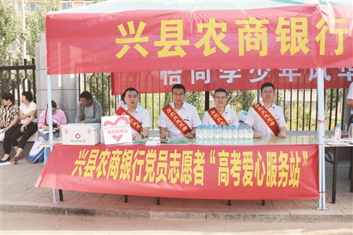 高考期间,山西兴县农商银行积极开展“爱心助考”活动,设立“高考爱心服务站”,准备了矿泉水、2B铅笔、橡皮、解暑药物、遮阳帐篷等便民物品,为高考助力、为考生加油,向广大学子、家长奉献一份作为兴县本土银行的爱心和责任。