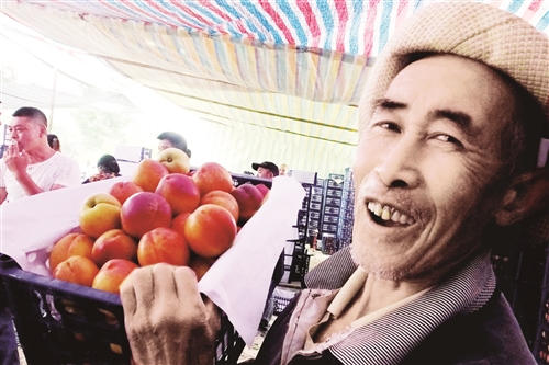 图为首届油桃节开幕式上,桃农南天梁在市场销售丰收的油桃。