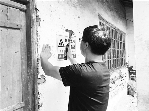 图②:上海市崇明区供销合作社工作人员检查危房情况。崇明区社供图