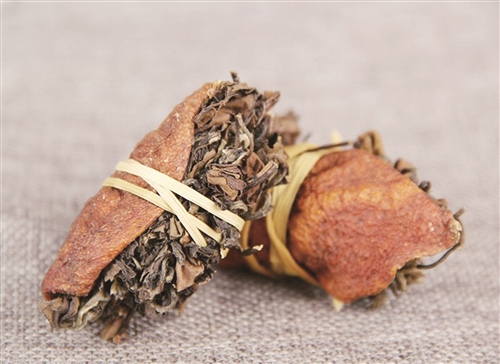 上年纪的“老广”,都有居家自备“三宝扎”的习惯,它是以陈皮包裹橄榄,再用禾秆草捆扎,置入粗盐罐中腌制三年以上即成。此物可用来泡水饮用,也可拿来煲粥、炖汤,风味鲜明。对于熬夜上火、咽喉肿痛、声音嘶哑等症状具有缓解作用,尤其适宜烟酒过量人士饮用。在常年气候湿热的珠三角,“广东三宝”实为最具代表性的地方特产之一,也很能体现粤人传统的食疗养生理念。经过粗大海盐粒腌制数年之后,陈皮已变为棕黑色,陈皮的果香、橄榄的清香、禾秆草的糯香无缝融合在一起。