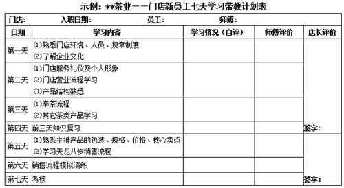 新人带教计划,是新人能力成长的阶梯,也是师傅的带教工作安排,更是新人学习成效验收的指南。它需要师傅与新员工充分沟通,全面评估新员工的能力素质表现后,为每位新员工量身打造,并通过店长的审核确认。(见“门店新员工七天学习带教计划表”)
