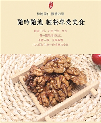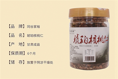 成县核桃栽植历史悠久,以其粒大、仁饱而驰名中外,是传统出口创汇农副产品,也是全县农村经济支柱产业之一。同谷家裕琥珀核桃仁,果仁饱满、清香酥脆,采用成县核桃整颗去壳,地道蜂蜜薄糖包裹整片果仁,入口甘甜酥滑。琥珀核桃仁富含维生素、膳食纤维、高蛋白质等多种营养元素,适合中老年人、抵抗力低下等人群。