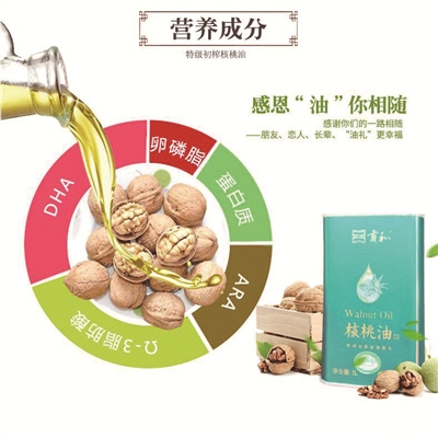 核桃油源于云南丽江,用雪域野生铁核桃压榨而成,每一滴都来自精心酝酿。云南核桃列为世界四大干果,它的足迹遍及世界各地。核桃在国外,人称“营养丰富的坚果”“益智果”,在国内有“外岁子”“长寿果”“养人之宝”的美称。核桃油用500年的历史证明了它的健康、营养、安全,被誉为“油品中的圣品” 。