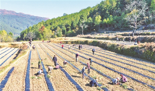 11月3日,四川省南江县桥亭镇落垭村茶叶专业合作社雇请的工人在新建的200多亩茶园基地栽植茶苗。据悉,南江县今年在桥亭、下两等茶叶主产乡镇落实的1.7万亩茶苗栽植任务将在11月底全面完成规范化定植,为推进乡村振兴产业发展夯实了基础。
