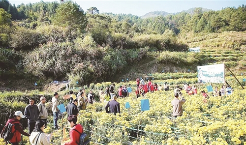 据了解,“婺牌皇菊文化节”活动已经连续举办11届,每年邀请来自全国上百家经销商品鉴交流,洽谈合作协议,签订合同达百万元,有力的推动了皇菊市场拓展。本届皇菊节活动为期3天,举行了皇菊开采启动仪式、采摘竞赛、篁岭赏秋、婺牌茶舍参观学习等系列活动。图为采菊开园活动现场。